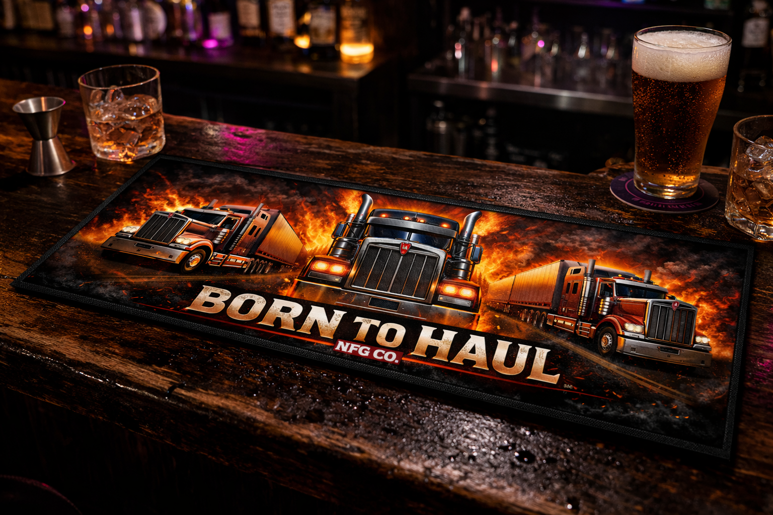 The BORN TO HAUL Bar Mat is designed for those who don’t just drive trucks—they live it. Featuring a powerful lineup of Kenworth rigs tearing through flames, this mat brings serious presence to any bar, shed, or garage setup.