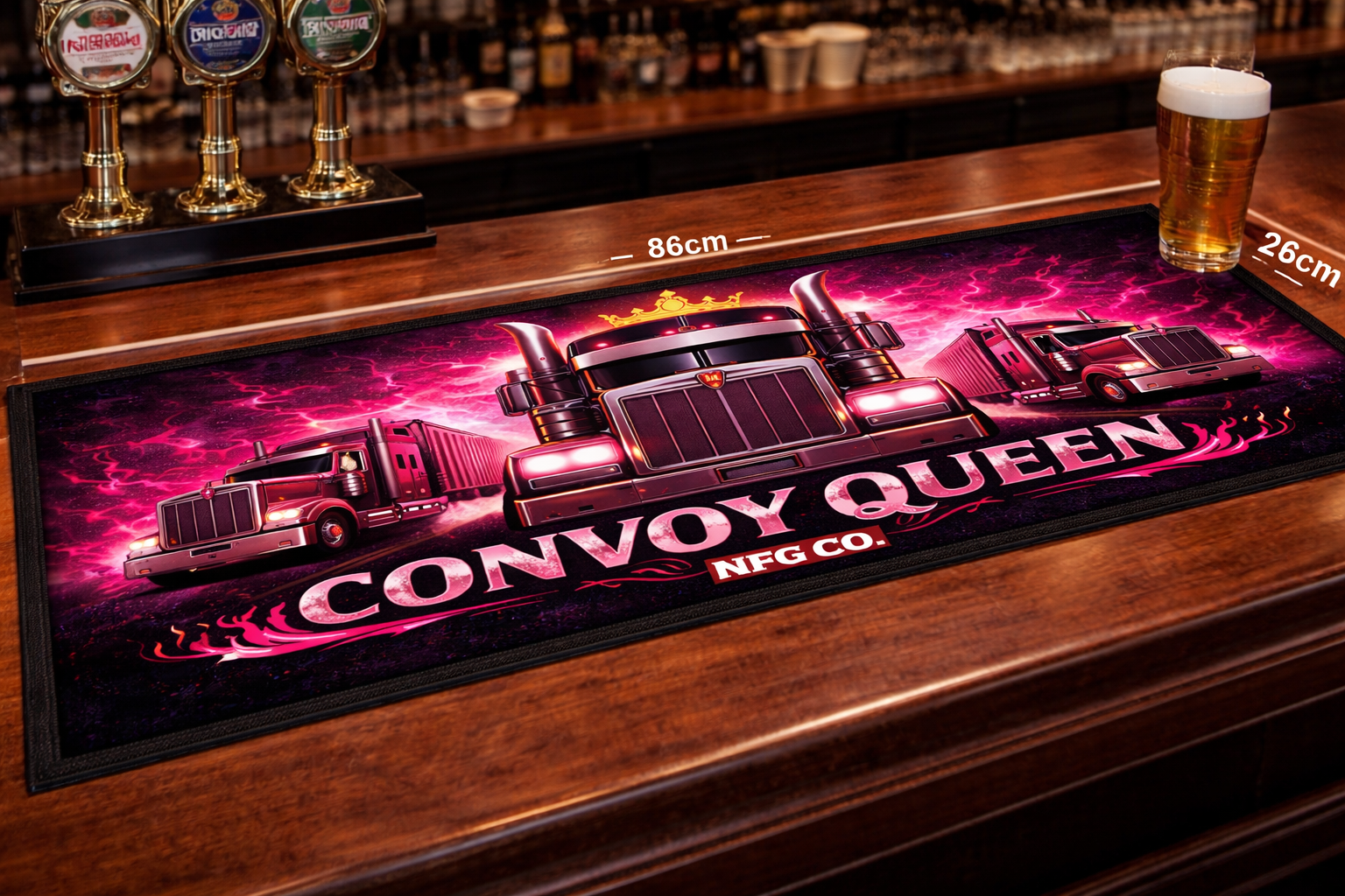 Make a statement at your bar with the bold and unapologetic Convoy Queen bar runner. Designed for those who live loud and ride proud, this eye-catching piece features a powerful lineup of trucks set against an electrifying pink storm backdrop, crowned with attitude and finished with signature NFG Co. branding.