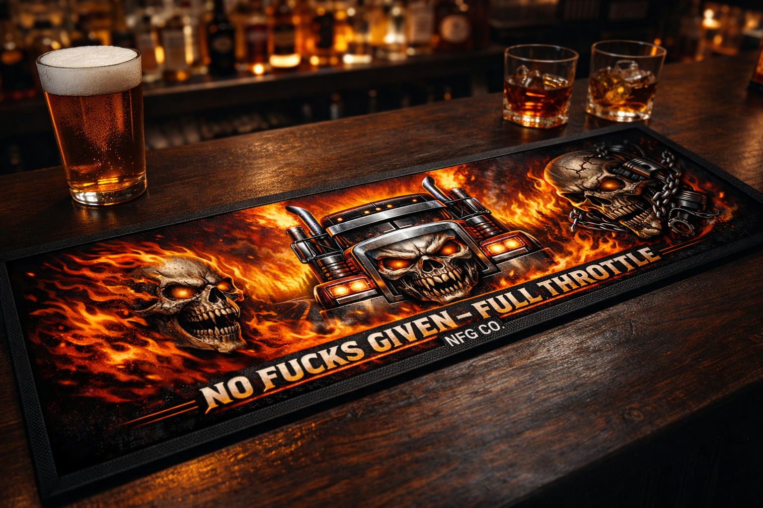 The NO FUCKS GIVEN – FULL THROTTLE Bar Mat is built for truckies, shed bars, and anyone who backs their lifestyle with zero compromise. Featuring a brutal skull-front rig tearing through flames, this design hits hard and stands out in any setup.