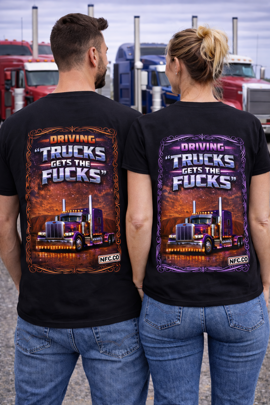 The phrase “Driving Trucks Gets the Fucks” is classic tongue-in-cheek truckie humour, the kind you’d hear over a UHF radio or at a roadhouse after a long haul.