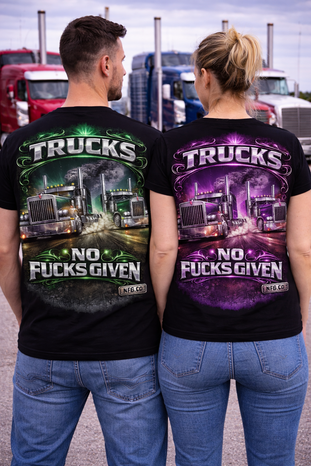 The phrase “Trucks – No Fucks Given” represents that classic trucker mindset — tough, independent, and not worried about other people’s opinions.