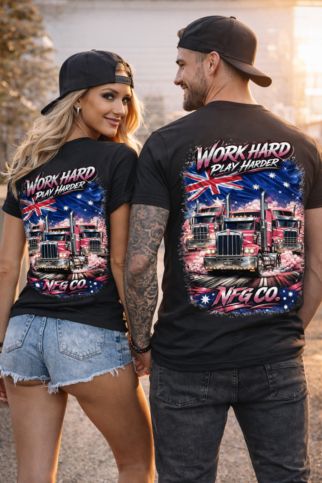 Featuring bold pink Kenworth trucks tearing through smoke with an Aussie flag backdrop, this back print hits hard and stands out anywhere—from the yard to the pub.