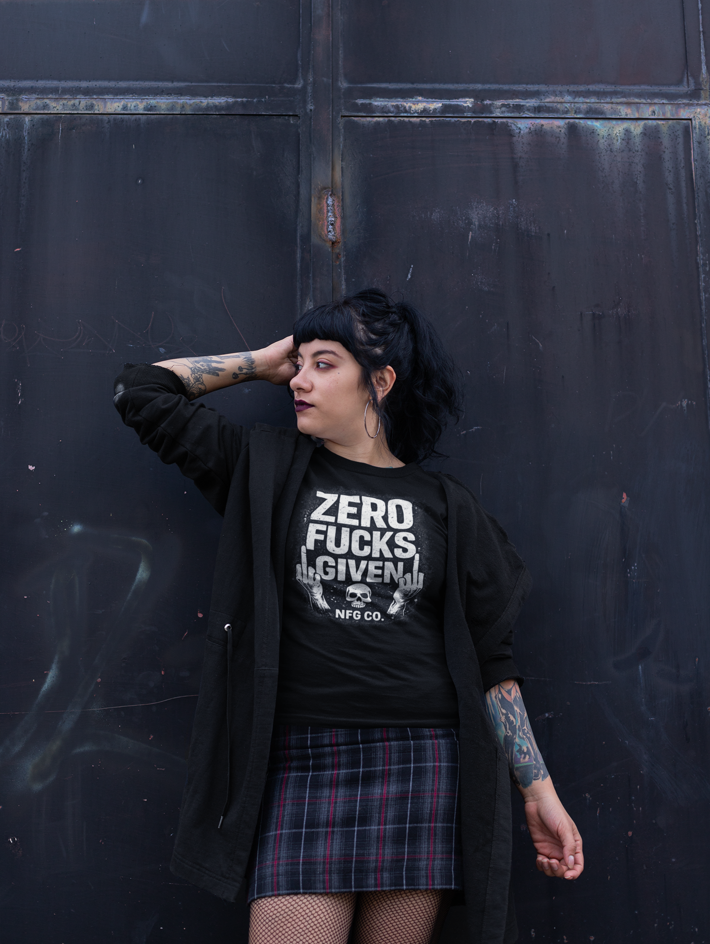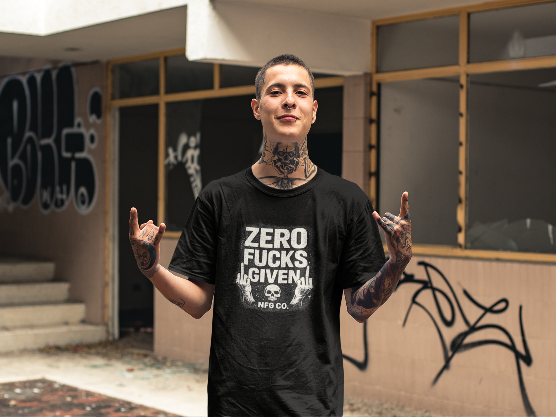 This Zero F*cks Given tee is built for the unapologetic. Featuring bold distressed typography, skeletal middle fingers, and the signature NFG CO. stamp, this design doesn’t whisper — it makes eye contact and dares you to say something.